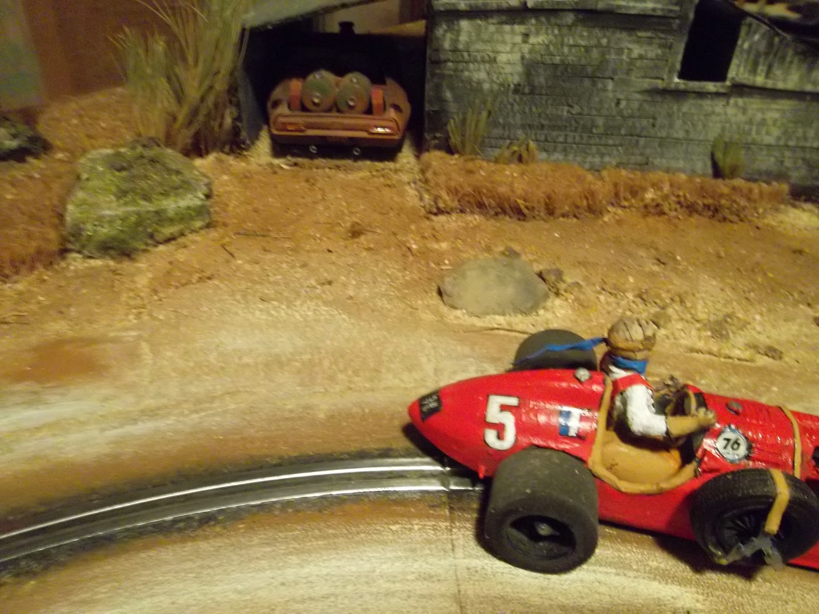 I added a 1999 Subaru WRC car. This particular car did not come with a driver, so i bought a driver on Ebay that was made by Cox in 1965. More trees and groundwork have been added.